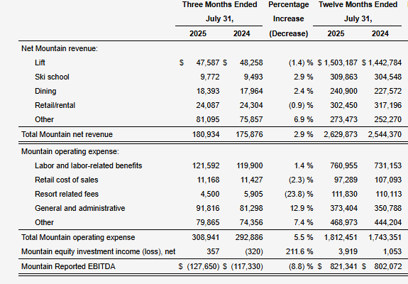 The vast majority of ebitda comes from Mountain operations, which break down like this: