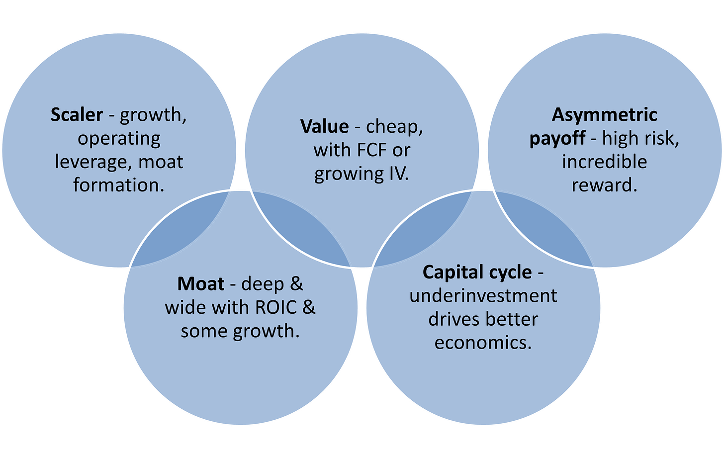 Moat businesses are fairly mature and have deep economic moats allowing them to earn above-average returns on capital. They are usually able to combine moderate revenue growth with operating and financial leverage to compound earnings attractively over time. Management is key. Moats are not an intrinsic feature of a business, especially in younger/smaller businesses. Moats are the result of good management decisions compounded over time. They can be strengthened, and they can be weakened. Perhaps the deepest and least-appreciated moat is exceptional management and carefully-crafted culture, which can turn even a fairly commoditised business such as insurance into a moaty compounder like Berkshire Hathaway.