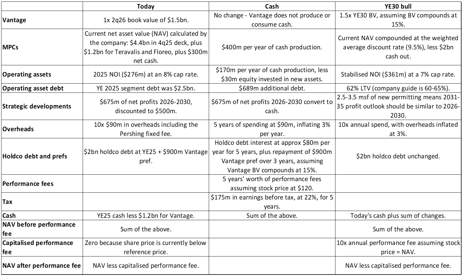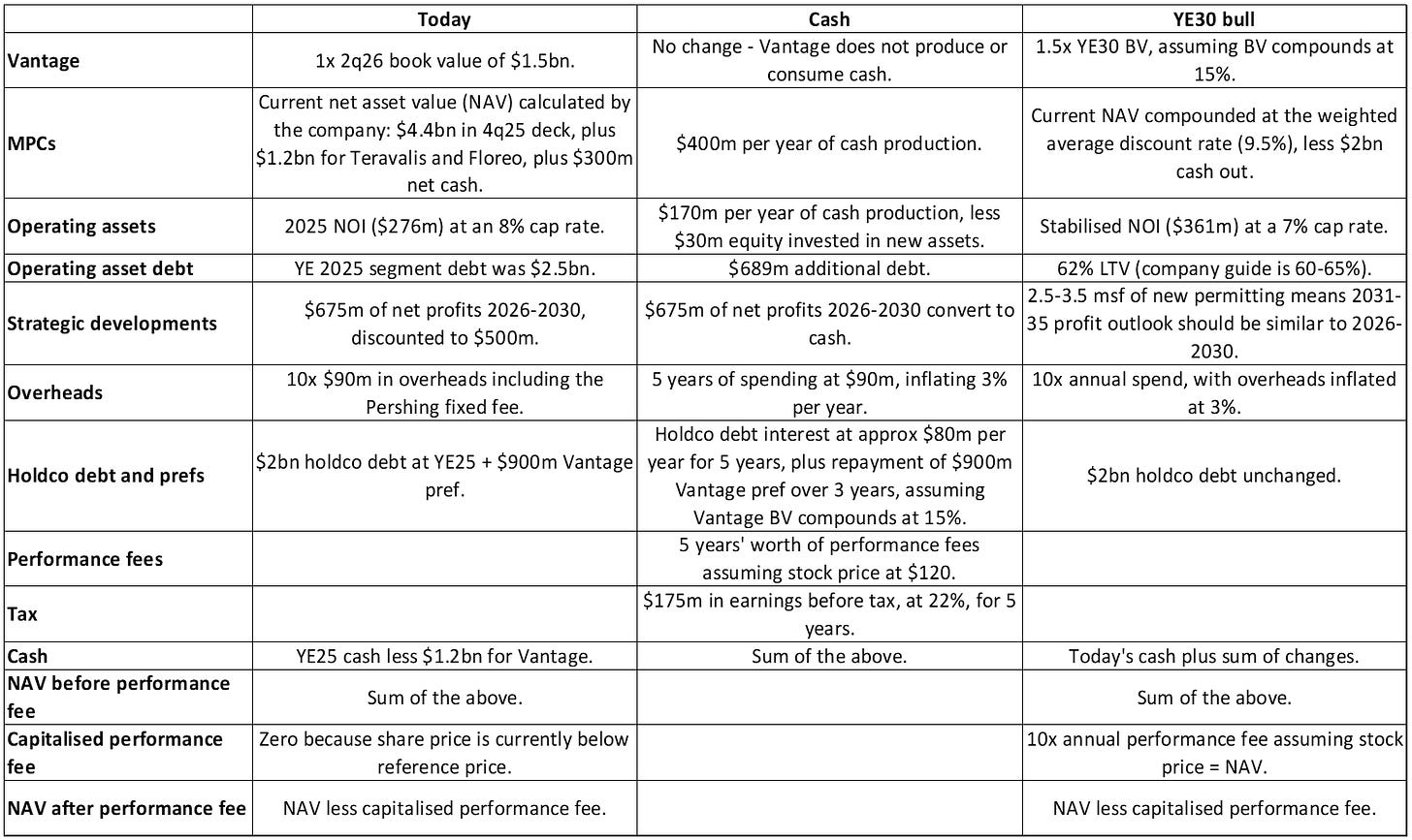 HHH guide to $82-92m in overheads in 2026. I assume $90m and capitalise this at 10x. I also assume overheads inflate at 3% per year, which feeds into my cash projection and my capitalised overheads figure for 2030.