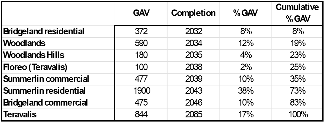 The third valuation measure is Gross Asset Value (GAV), which is a discounted cash flow. The table below shows % of GAV and planned sell out dates for each of the MPCs. By 2036, all of Bridgeland residential and The Woodlands, and Woodlands Hills will have been sold, along with perhaps half of Summerlin. That accounts for around 50% of today’s GAV. By 2046, Bridgeland commercial, Summerlin, and some Teravalis will have been sold, accounting for another ~35% of today’s GAV. By MPC standards, these timeframes are short: we are well into the monetisation phase. This data is from September 2024, which is the last breakdown of GAV that I can find: