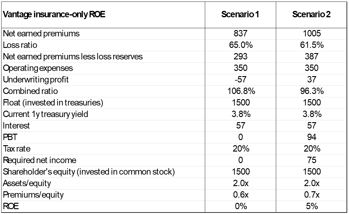 Vantage writes more premiums at a lower loss ratio and achieves insurance net profit equal to 5% of shareholder’s equity. Directionally, this is a fair representation of what a high quality insurer might average through the cycle.