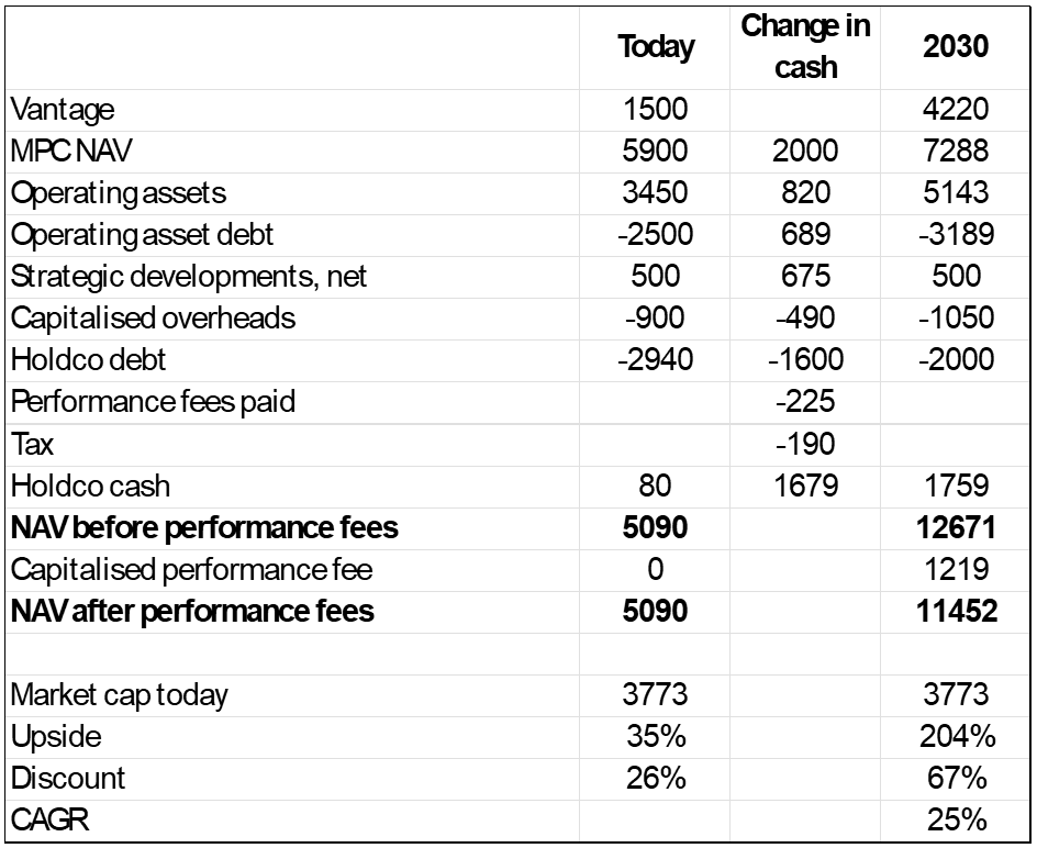 I don’t expect the stock to rise 36% to its current NAV any time soon. It has traded at a discount for years. But I do think the 2030 NAV is realistic. Not conservative, perhaps, but realistic. I assume good performance from each of the assets, but not spectacular. Vantage shareholders’ equity could easily compound faster than 15%. MPC NAV might not beat my assumption, but with 50% of today’s GAV being sold in the next 10 years the duration of the cash flows will shorten considerably, reducing risk and helping the stock trade closer to intrinsic value. I assume operating assets reach their guided stabilised NOI, but not that any more assets are built. I assume future strategic developments achieve similar economics to current ones, not better, and that the Ritz Carlton Residences success can’t be replicated elsewhere in the MPCs. And I assume $1.7bn of accumulated cash sits on the balance sheet, undeployed.