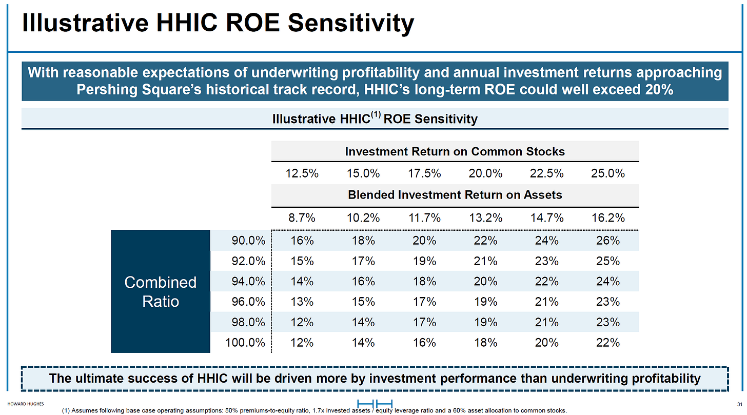 The magic of this model is that it might well produce 20% or 25% compounded returns. Pershing Square say they aim for 20% returns on their common stock investments, and insurance could easily add 5%. This is why excellent insurer-investors like Berkshire Hathaway and Fairfax Financial have produced such exceptional compounded track records over time. Before acquiring Vantage, HHH produced this useful table showing how common stock returns and combined ratios drive compounding (the underlying assumptions about leverage and asset allocation are broadly similar to mine):
