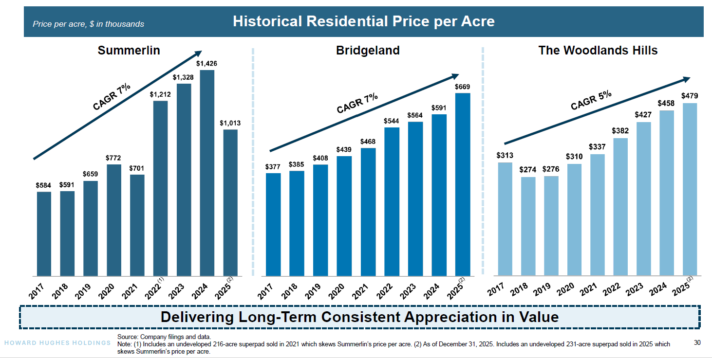 75% of current MPC profits come from Summerlin (22,500 total gross acres along the western rim of the Las Vegas Valley) which opened in 1990, and another 22% from Bridgeland (11,500 total gross acres in Houston) which opened in 2010. The other MPCs are The Woodlands and Woodlands Hills (Houston) which are smaller but are scheduled to ramp profits over the next few years, and Teravalis (33,800 total gross acres in Greater Phoenix, Arizona), which only started in 2024 and is targeted for completion in 2086. In maturity terms Teravalis is the baby of the portfolio, but it is a very big baby.