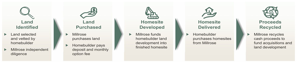 Millrose finances land banks for homebuilders. Homebuilders find a property they want; Millrose buys it; the homebuilder pays a deposit and an option premium; Millrose funds the development of horizontal infrastructure (roads, utilities, landscaping etc.); the homebuilder can then build and sell homes; and then, finally, the homebuilder exercises its option to buy the property.