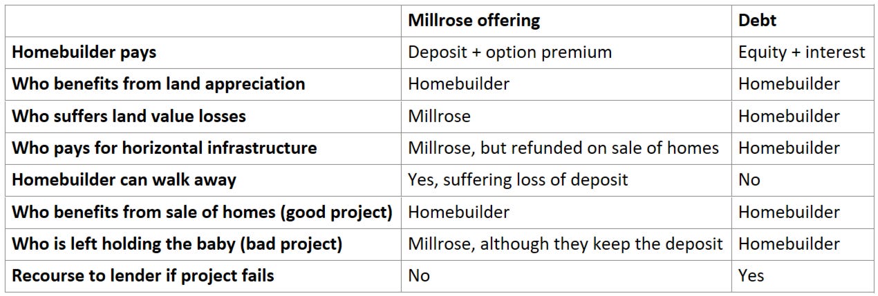 To go capital-light, therefore, homebuilders need to get land off their balance sheet while keeping access to it, keeping the economic upside, and transferring most of the risk. And that is exactly what Millrose lets them do.