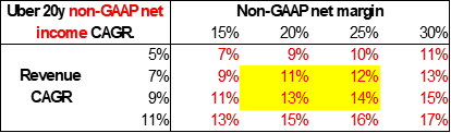 The next table takes the revenue CAGR range in yellow in the table above, and shows the resulting 20-year non-GAAP net income CAGR under different margin assumptions: