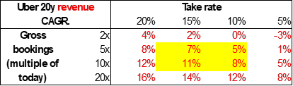 This table shows what would happen to Uber’s 20 year revenue CAGR under very different gross billing and take rate scenarios:
